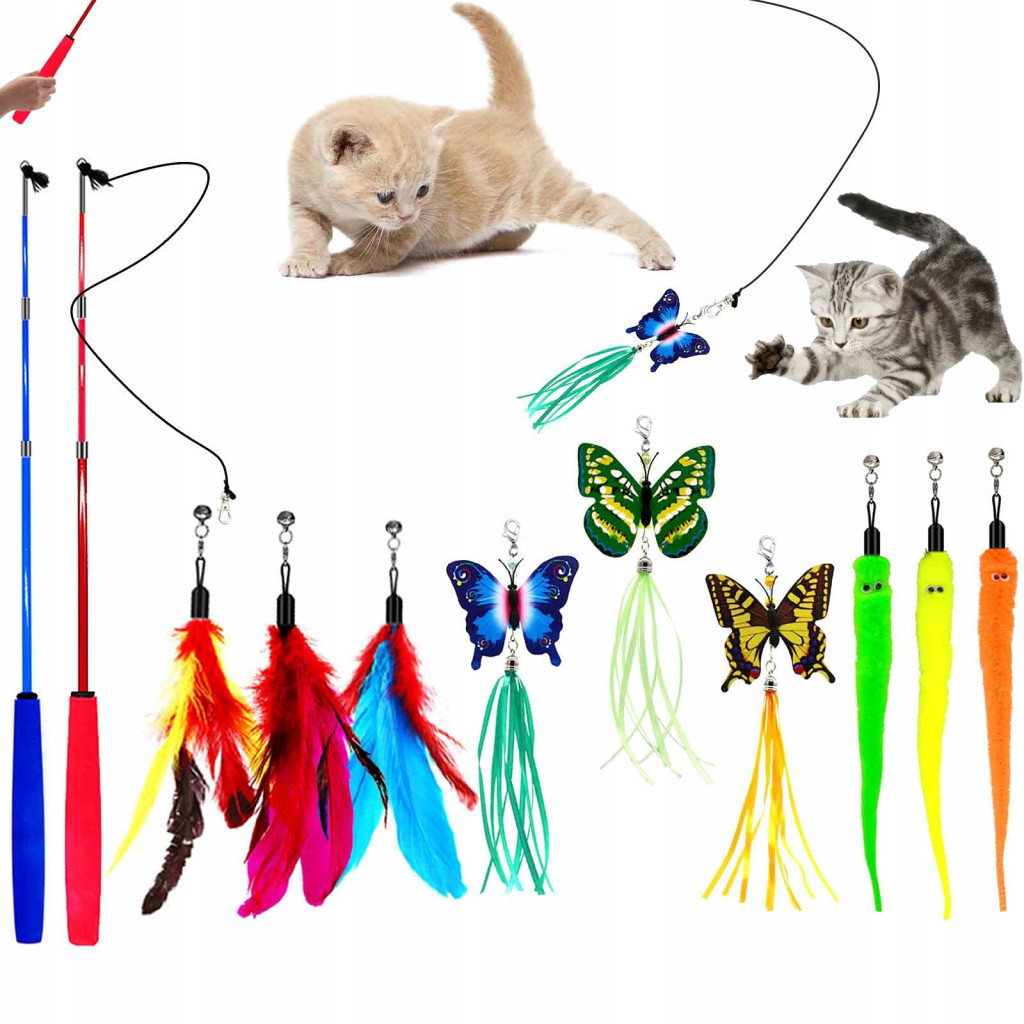 【Świetny zestaw zabawek dla kota】łącznie 11 elementów, w tym 2 wysuwane różdżki dla kota i 9 wkładów (3 poruszające się robaki, 3 piórka i 3 motyle). To świetny prezent dla wszystkich kotów