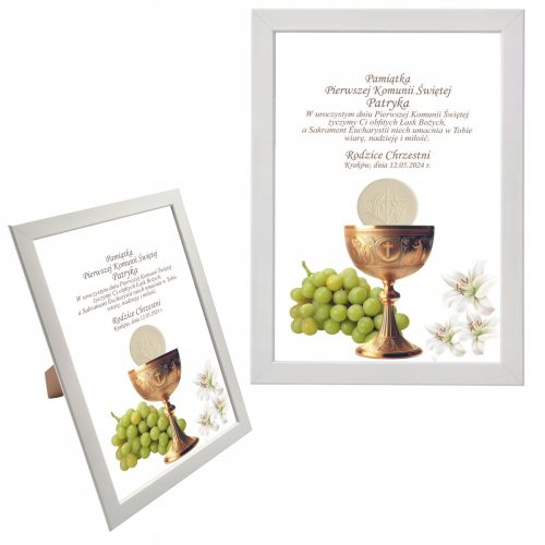 Z okazji Pierwszej Komunii Świętej! Oferujemy wspaniałą propozycję, która będzie doskonałym prezentem dla Twojego dziecka lub chrześniaka. Nasze ramki mają wymiary 33x24cm i są wykonane nowoczesną techniką druku, co gwarantuje wysoką jakość i trwałość. Dodatkowo posiadają możliwość powieszenia lub postawienia, co sprawia, że są uniwersalne i pasują do każdego wnętrza. Wybierz ramkę, która podkreśli piękno tego wyjątkowego momentu i będzie trwałą pamiątką na lata!