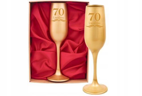 Elegancki szklany kieliszek, w kolorze złotym udekorowany jednostronnym napisem "70 urodziny". Delikatne grawerowane zdobienia dodające uroku. Zapakowany w prezentowe pudełko wypełnione satyną, gotowe do wręczenia jako prezent!