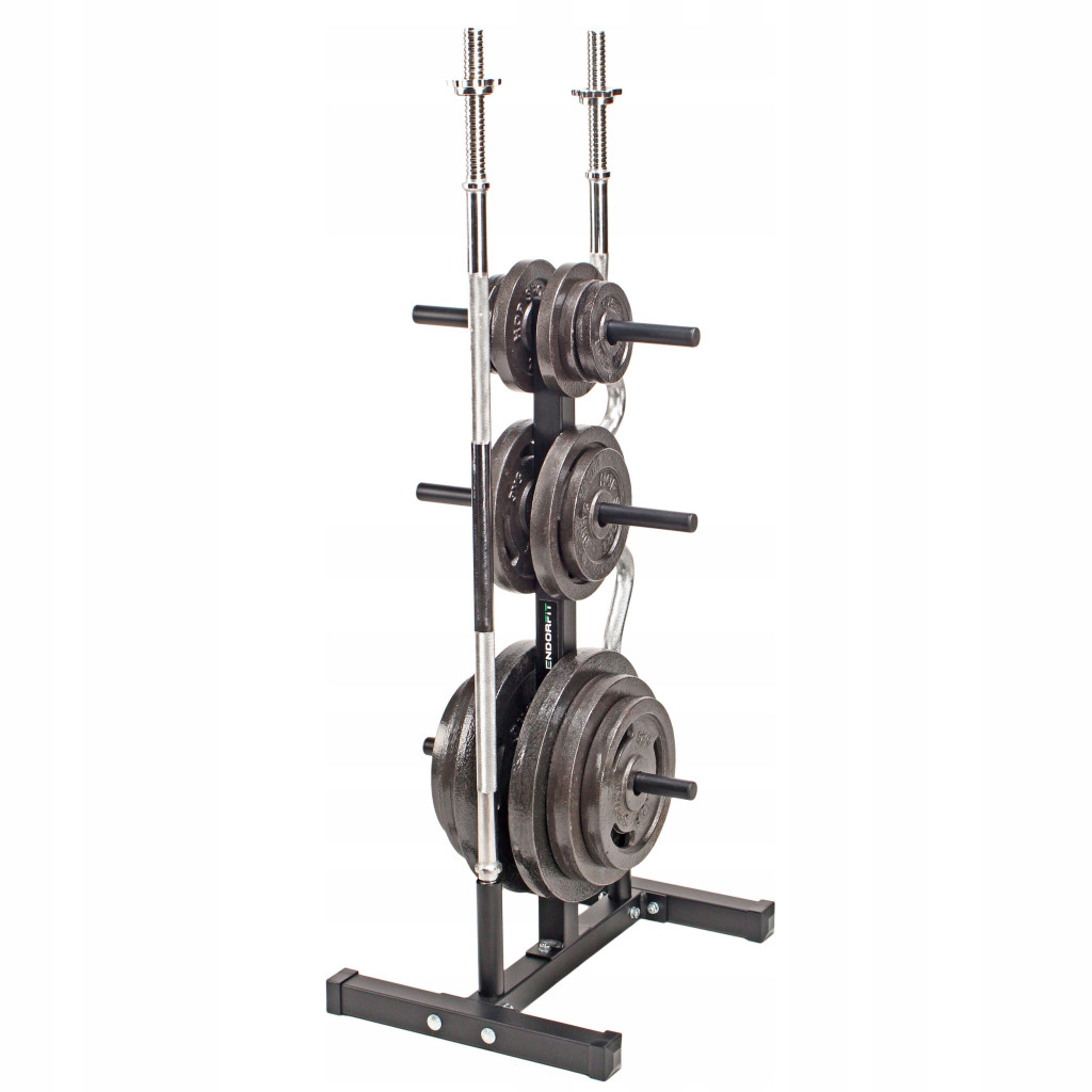 Stojak Endorfit EH-S112 jest niezbędny, jeżeli trenujesz regularnie ze sztangą, gryfami i hantlami regulowanymi. Dzięki niemu w każdym miejscu do ćwiczeń - w pokoju, w garażu, w domowej siłowni - zachowasz porządek, który jest podstawą bezpieczeństwa treningu siłowego. Ponadto zawieszając talerze na uchwytach stojaka, dbasz o nie najlepiej, jak można. Talerze nie obijają się i nie zarysowują, a przy tym nie niszczą podłogi. Uchwyty na gryfy zapewniają ich najwygodniejsze przechowywanie. Najczęściej nie ma z nimi co zrobić i leżą na podłodze, a na stojaku EH-S112 będą ustawione pionowo, blisko obciążeń, zawsze pod ręką.