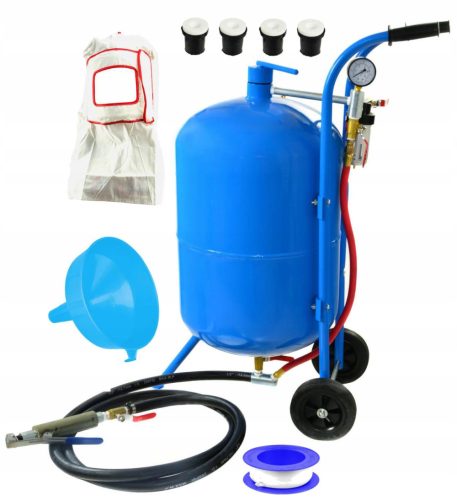 Wyposażona w dysze i pistolet do piaskowania, zawór odcinający, manometr, wąż do piaskowania, lejek do napełniania zbiornika oraz maskę ochronną z szybką z pleksi.