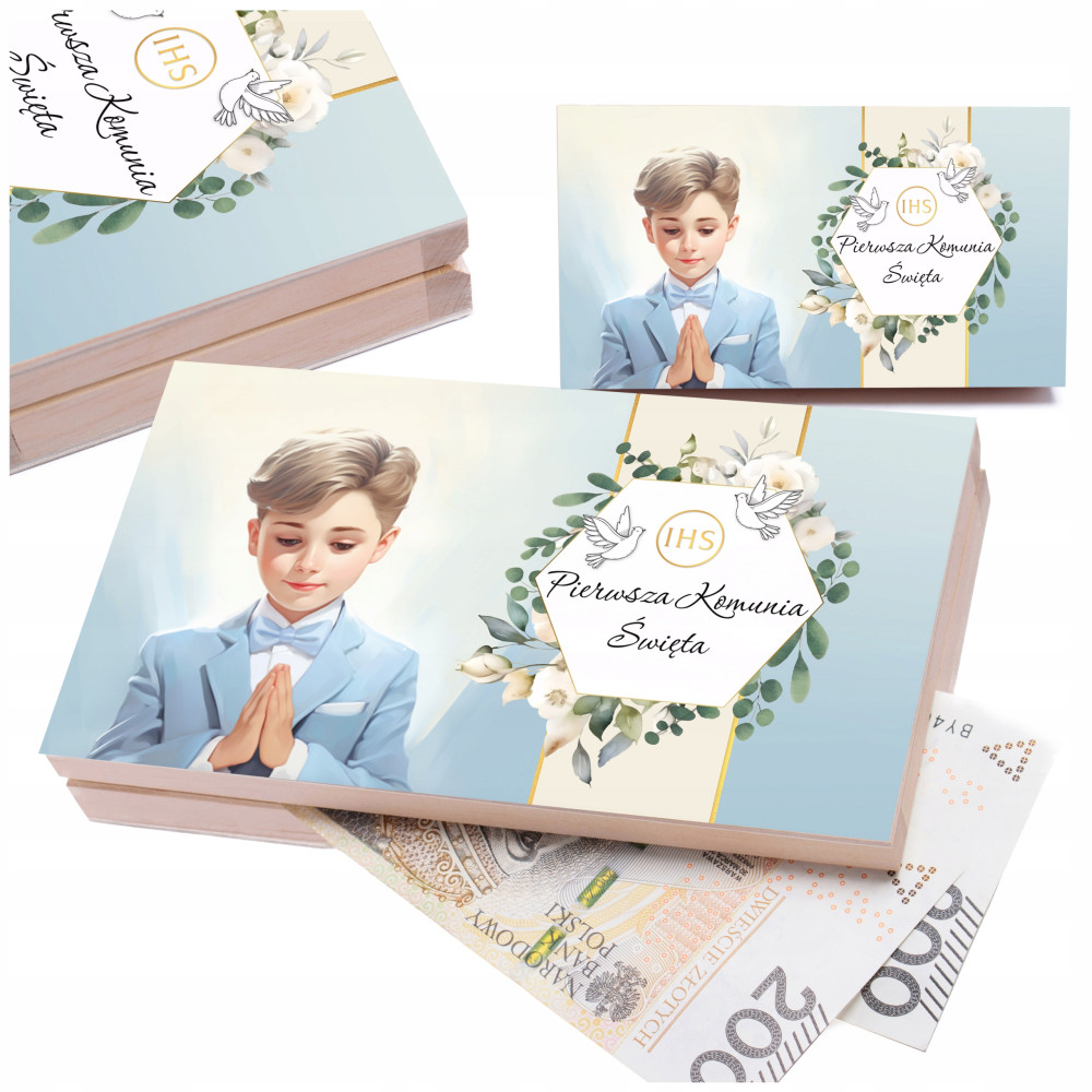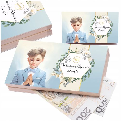 Drewniane pudełko na pieniądze to doskonała pamiątka Pierwszej Komunii Świętej jak i elegacka forma przekazania prezentu.