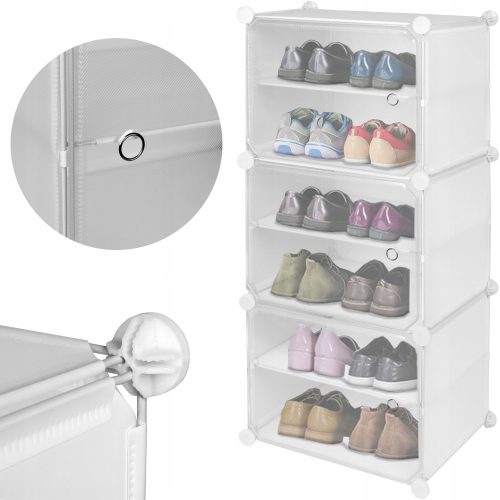 Szafka Pola pozwoli Ci zachować porządek z Twoim obuwiem. Chroni zawartość komór przed kurzem, jest wodoodporna i łatwa w utrzymaniu w czystości. Niewielkie rozmiary i modułowa konstrukcja sprawia, że model doskonale nada się jako uzupełnienie garderoby. Każda komora posiada dwie półki, w których bez problemu zmieścisz obuwie czy garderobiane dodatki. Jeśli chcesz mieć większą komorę, po prostu nie montuj półki. Wszystko zależy od Twojej wyobraźni. Przezroczyste okienka ułatwiają identyfikację obuwia w poszczególnych komorach. Drzwi w szafce można montować lewostronnie i prawostronnie. Każda z półek wykonana jest z metalowego stelażu i wodoodpornego materiału. Montaż szafki jest łatwy i zajmuje niewiele czasu. Wystarczy połączyć poszczególne półki łącznikami z tworzywa ABS. Modułowa konstrukcja szafki Pola pozwoli Ci puścić wodze fantazji i skonstruować szafkę na buty o różnych kształtach i wymiarach. Wystarczy połączyć kolejne moduły ze sobą, by stworzyć garderoby i szafki na obuwie o dużych rozmiarach.