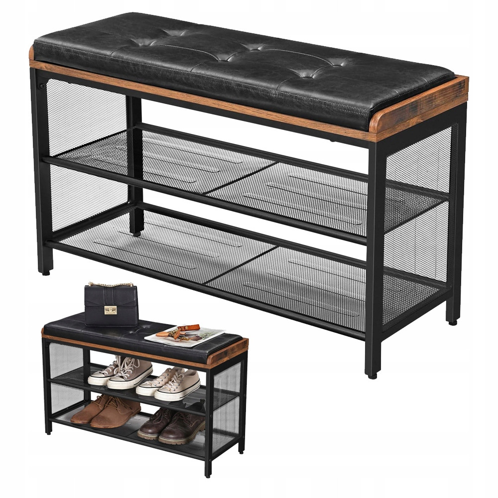 Połyskująca czarna sztuczna skóra, dwie półki wykonane z siatki stalowej na buty, splecione z powierzchnią o vintage'owym stylu imitującym solidne drewno - naprawdę szafka prezentuje się szykownie.