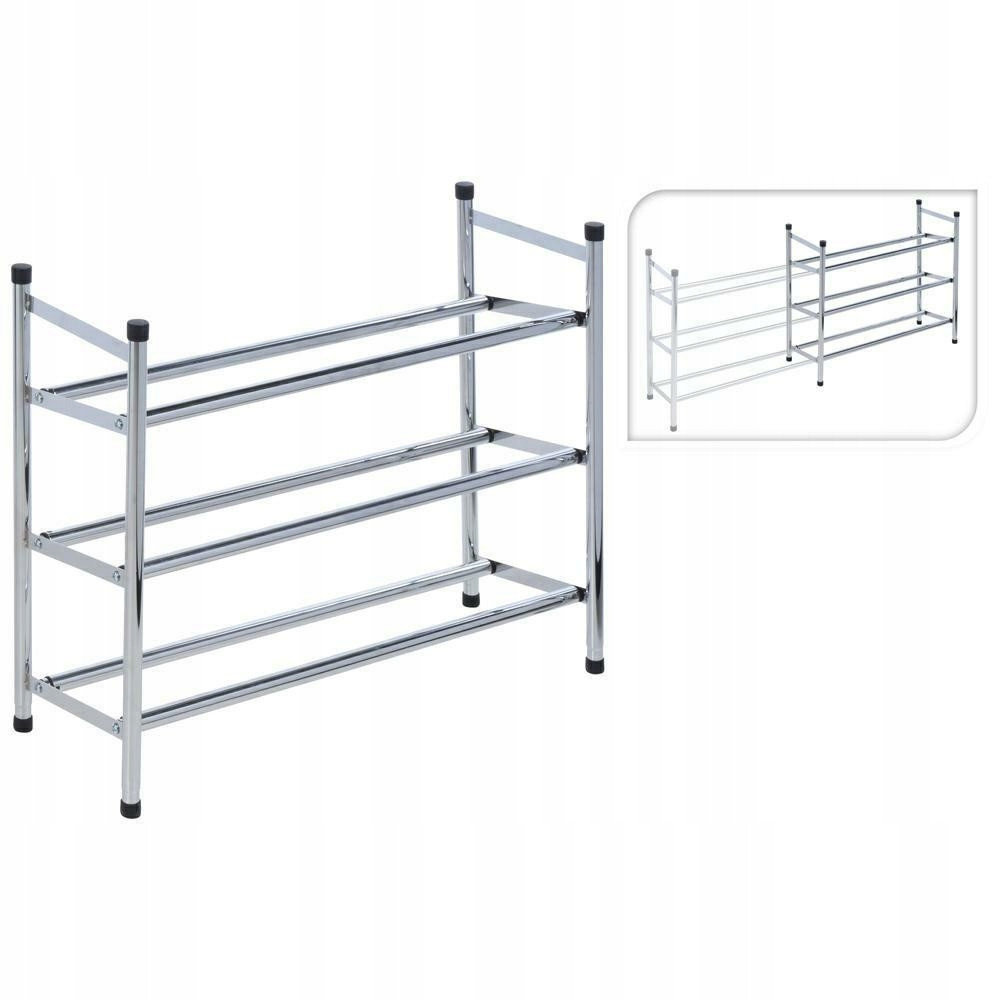 Rozsuwana półka, szafka na buty w nowoczesnym stylu. Półka wykonana z chromowanego metalu. Półka jest trzy poziomowa, teleskopowa, rozsuwana. Można ją wydłużać i zmniejszać według potrzeb w danym momencie. Istnieje także możliwość połączenia kilku półek razem. Taka szafka świetnie spełni swą funkcję w przedpokoju. Posłuży także jako regał w piwnicy czy garażu.