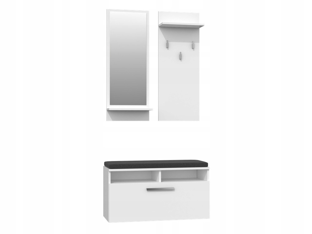 GARDEROBA DO PRZEDPOKOJU MODEL: "RIVA" LUSTRO Z PÓŁKĄ WIESZAK Z PÓŁKĄ SZAFKA Z SIEDZISKIEM I PRAKTYCZNYM SCHOWKIEM KOLOR: BIEL Idealna propozycja dla osób, które doceniają posiadanie pięknych mebli w swoim mieszkaniu. Mebel w stylu nowoczesnym, sprosta oczekiwaniom wszystkich, którzy cenią połączenie prostoty i elegancji. Nasza szafka na buty wykonana jest z płyty laminowanej o grubości 16 mm odpornej na ścieranie.