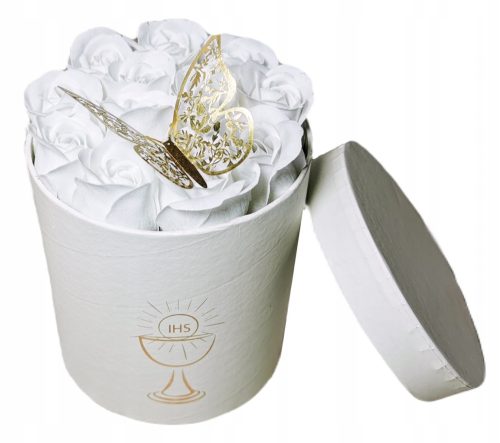 Flower box z nadrukiem IHS wypełniony pachnącymi mydełkami w kształcie róży.