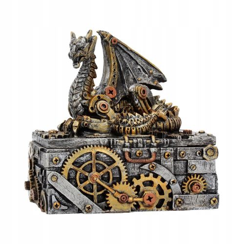 To przestronne pudło pokryte jest skomplikowanymi mechanizmami przekładni, kół zębatych oraz mosiężnymi nitami utrzymującymi stalowe opaski na miejscu. Na wieczku pudełka siedzi po królewsku mechaniczny Smok z zakręconym ogonem i wysoko uniesionymi skrzydłami, zazdrośnie strzegąc sekretów wnętrza tej skomplikowanej układanki.