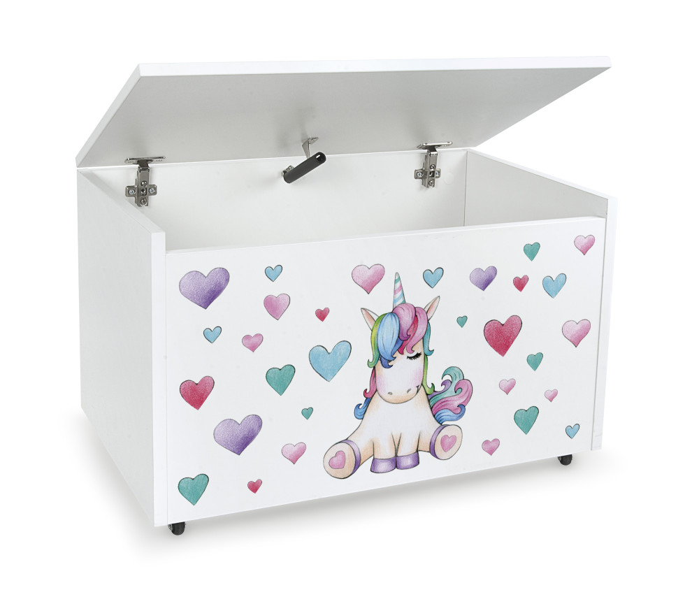 Pojemna (91 l.) i bardzo funkcjonalna skrzynia, która może służyć jako duży pojemnik do przechowywania np. zabawek oraz innych dziecięcych skarbów. W tej ofercie z nadrukiem UV motywu z jednorożcami. Na innych aukcjach skrzynie z innymi nadrukami ew. bez nadruku.