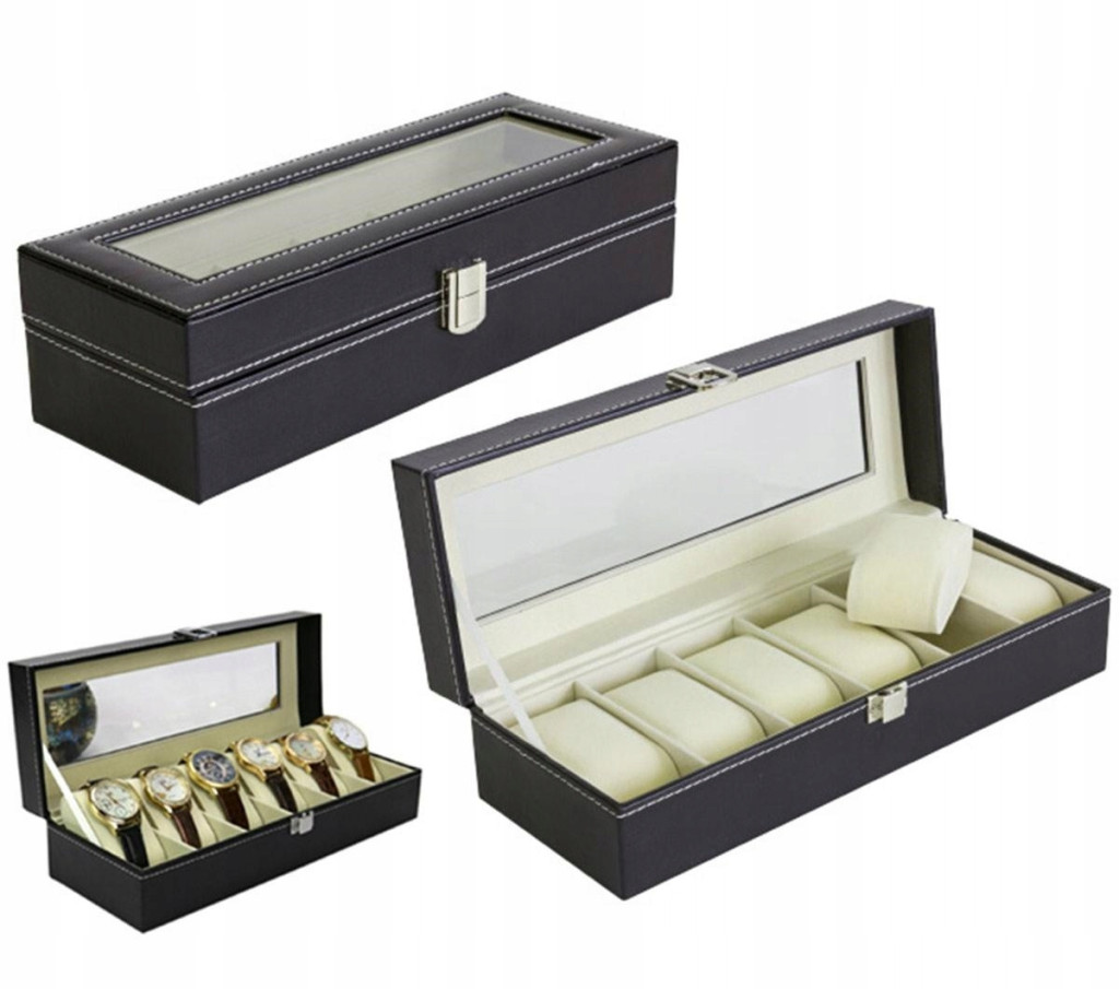 Niezwykle funkcjonalny kuferek / etui na 6 zegarków naręcznych lub bransoletki. Praktyczny organizer na zegarki został wykonany z eleganckiej eko-skóry w czarnym kolorze, przeszycia ze srebrnej nici dodatkowo podnoszą atrakcyjność etui. Dzięki czarnej barwie doskonale pasuje do wnętrz o każdym wystroju.