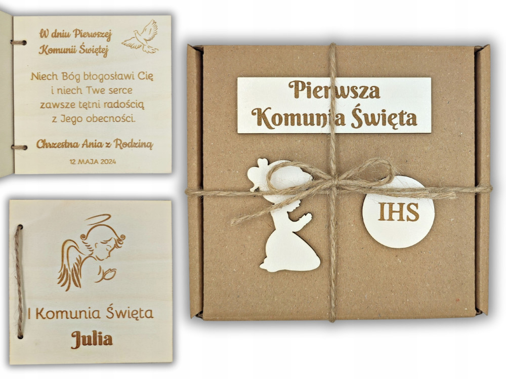 Drewniana kartka to oryginalna Pamiątka I Komunii Świętej.