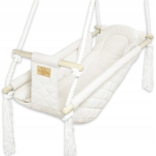 Kołyska wykonana jest z mocnych, oszlifowanych drążków oraz wytrzymałych linek bawełnianych. Siedzisko i usztywniona wkładka uszyte są najwyższej jakości tkaniny Velvet.
