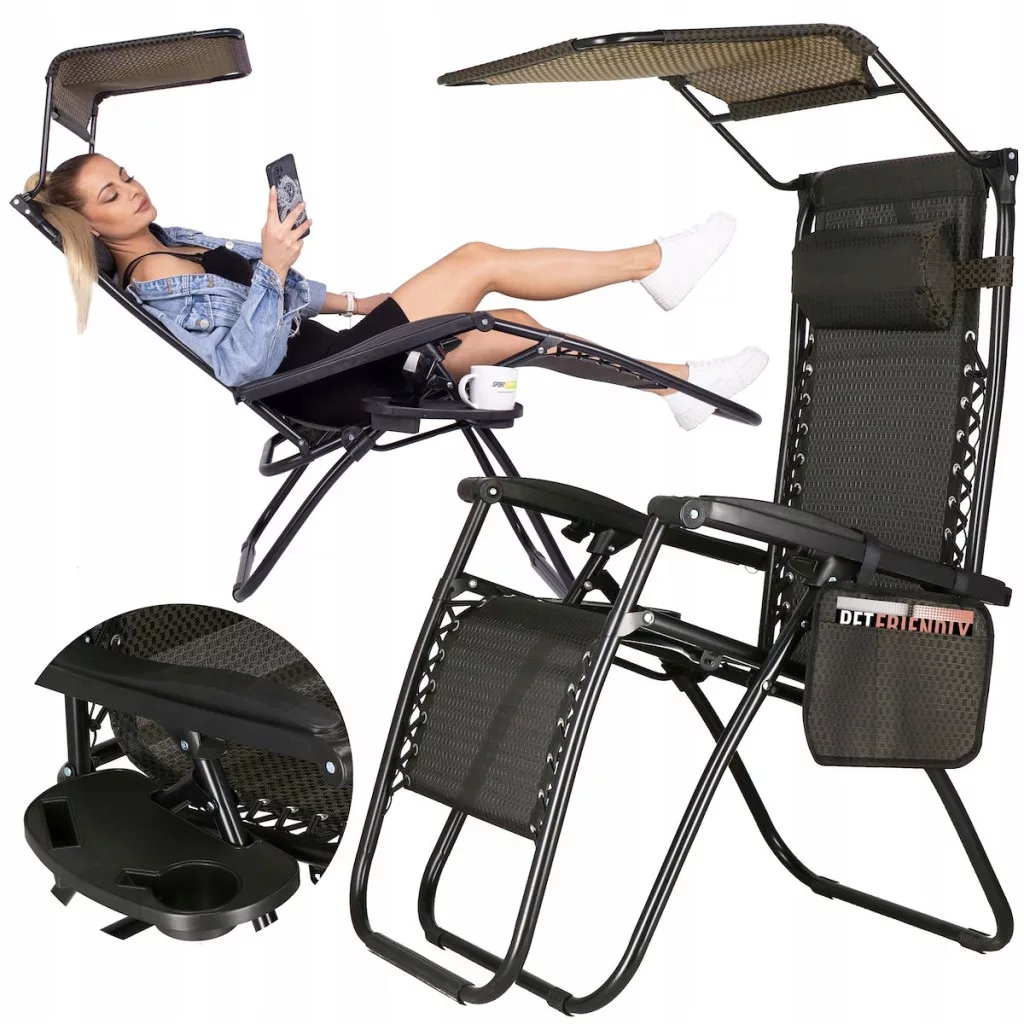 Leżak ZERO GRAVITY z daszkiem jest idealnym wypoczynkiem zarówno na balkonie, na plaży jak i na tarasie. Zapewni maksymalny relaks w każdym miejscu. Leżanka ma regulację ułożenia dzięki której samodzielnie dostosuje się ułożenie jej do własnych preferencji. Wyposażony został w GRATISY jakimi są