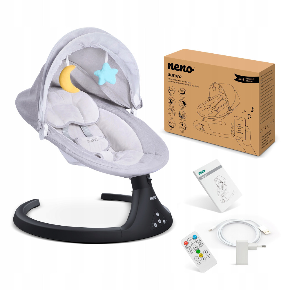 Neno Aurora – to produkt przeznaczony do użytku od 1. dnia życia dziecka. Nowoczesny elektroniczny bujaczek stanowi alternatywę dla naturalnego kołysania. Działa on w oparciu o ruch wahadłowy z 5-stopniową regulacją prędkości, który wycisza i uspokaja malucha oraz zapewnia komfortowy sen. Jego największe zalety to modyfikowalna konstrukcja (zdejmowany daszek i pokrowiec, odczepiane zabawki i poduszka), wgrane do pamięci kołysanki oraz możliwość sparowania przez BT z innymi urządzeniami.