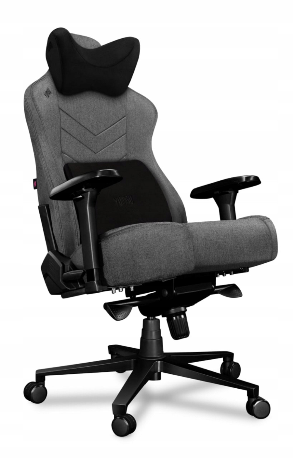 Yumisu stara się w tym aspekcie, jak najbardziej zadbać o kręgosłup użytkownika. Nie bez powodu w zestawie z fotelem znajduje się welurowa poduszka pod odcinek szyjny z pianki memory foam oraz specjalny wałek pod dolne plecy z tego samego materiału. Memory foam zapamiętuje Twoją sylwetkę i dopasowuje swój docisk do kształtu ciała, dzięki czemu możesz zdecydowanie dłużej przesiadywać przed ulubionym tytułem bądź przy pracy.