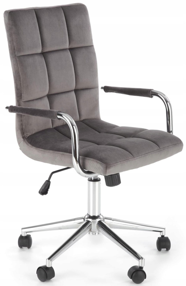 Bardzo atrakcyjny fotel obrotowy - młodzieżowy. Podstawa jezdna i podłokietniki wykonane z metalu, chromowane. Podłokietniki można zdemontować na życzenie. Siedzisko i oparcie tapicerowane pikowaną przyjemną w dotyku tkaniną welurową.