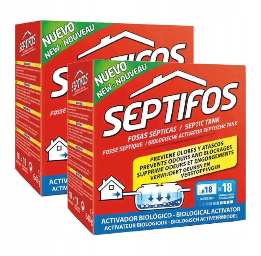 2 opakowania preparatu Septifos w saszetkach wspomagającego biodegradację zawartości szamba i działanie systemu kanalizacyjnego oraz niwelującego przykre zapachy.