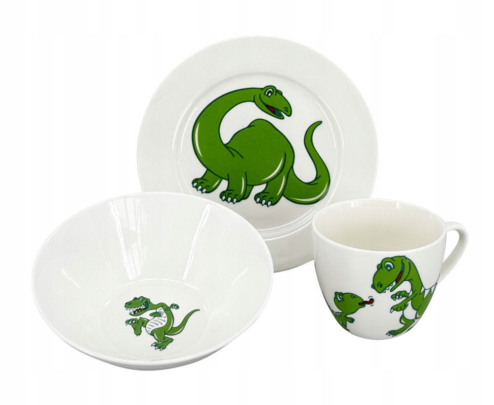 Zestaw obiadowy dla dzieci Dino, 3 szt. - talerz ø 20cm, miska ø 14cm, filiżanka o pojemności 220 ml, materiał porcelanowy, kolor biały, zielony wystrój dinozaura.