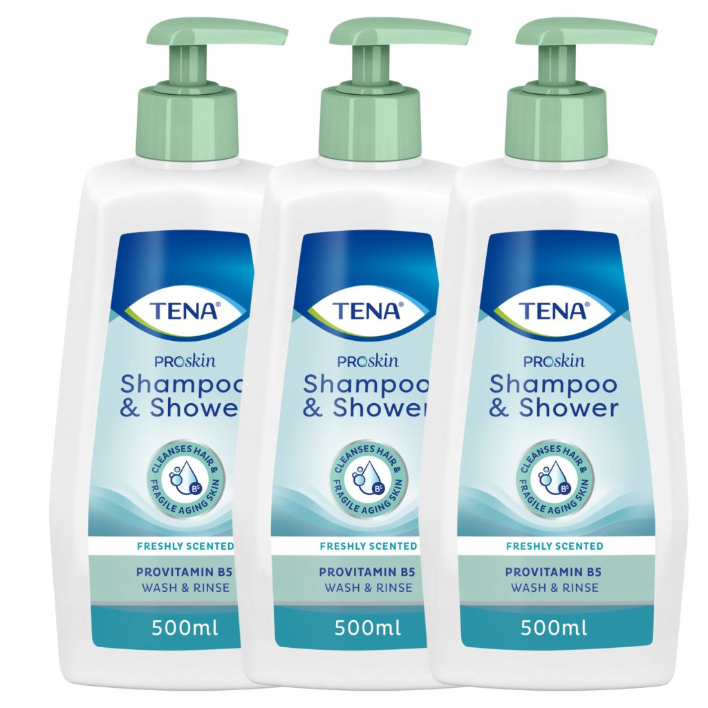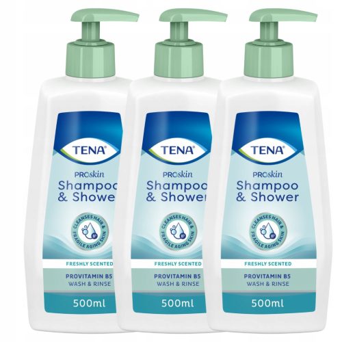 TENA Shampoo & Shower to żel pod prysznic i odżywczy szampon do włosów dwa w jednym. Stworzony specjalnie dla osób starszych o delikatnej skórze i włosach. Łagodna formuła o orzeźwiającym zapachu pozostawia skórę świeżą i czystą. Prowitamina B5 sprawia, że włosy łatwo się rozczesują. Umyć i spłukać wodą.