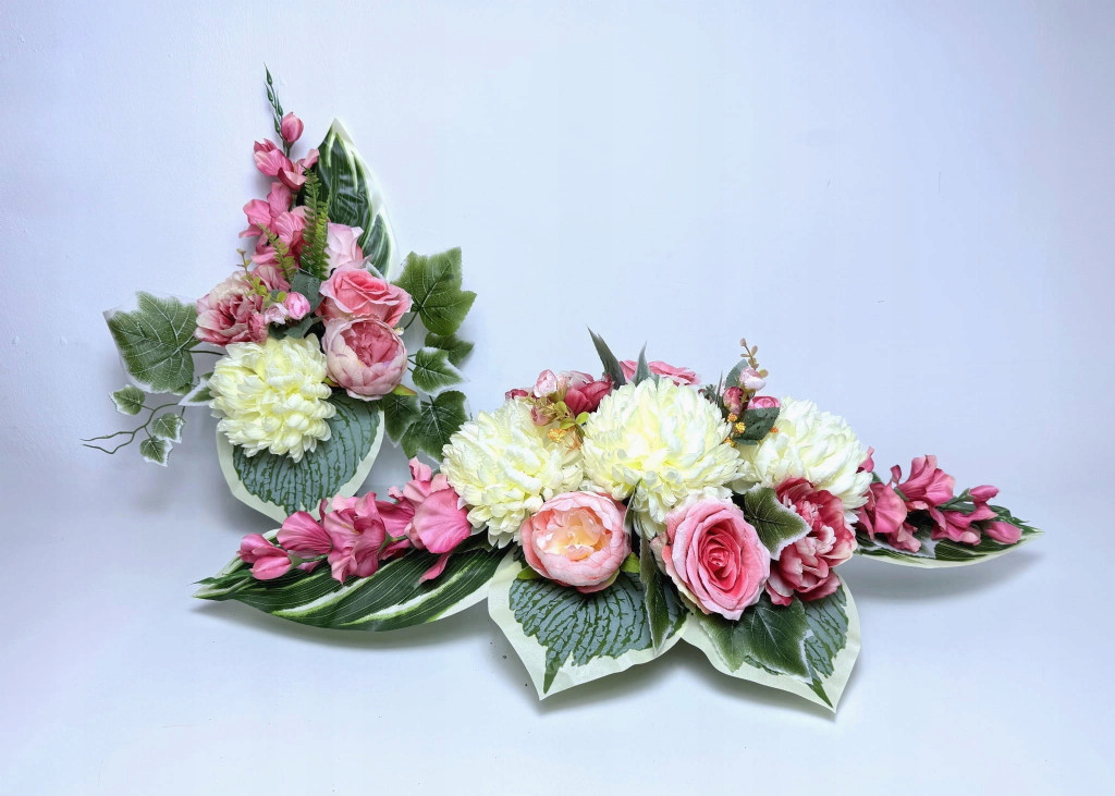 Ten elegancki zestaw nagrobny został zaprojektowany z myślą o stworzeniu harmonijnej, subtelnej i pełnej wdzięku dekoracji, która pięknie ozdobi miejsce spoczynku bliskich. Składa się z dwóch uzupełniających się elementów – efektownej kompozycji leżącej oraz dopasowanego bukietu do wazonu, co pozwala na spójną i estetyczną aranżację nagrobka.