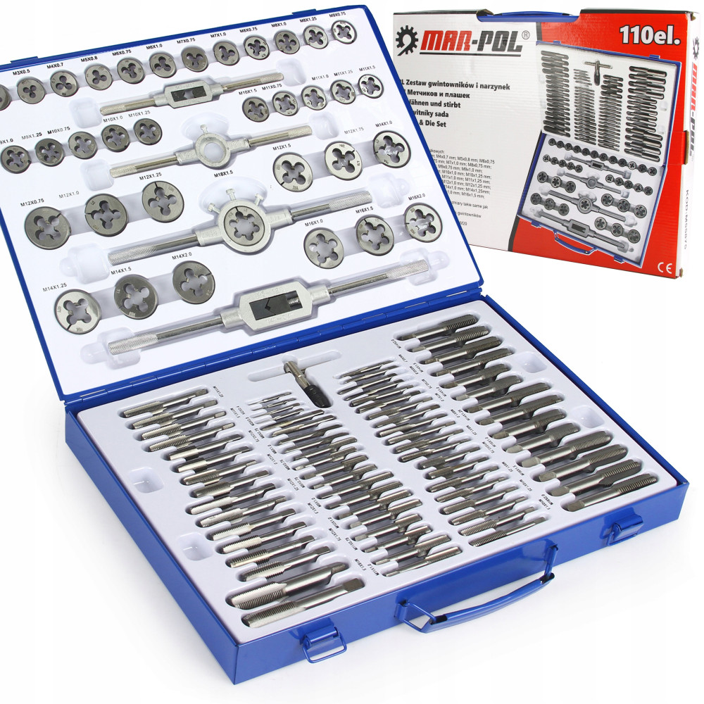 Gwintowniki i narzynki firmy MAR-POL wykonane z doskonałego materiału. Zestaw zawiera 110 elementów. Zapakowany jest w wygodną walizkę, która pozawala utrzymać porządek, łatwo transportować i błyskawicznie odnaleźć potrzebny w danej chwili element.