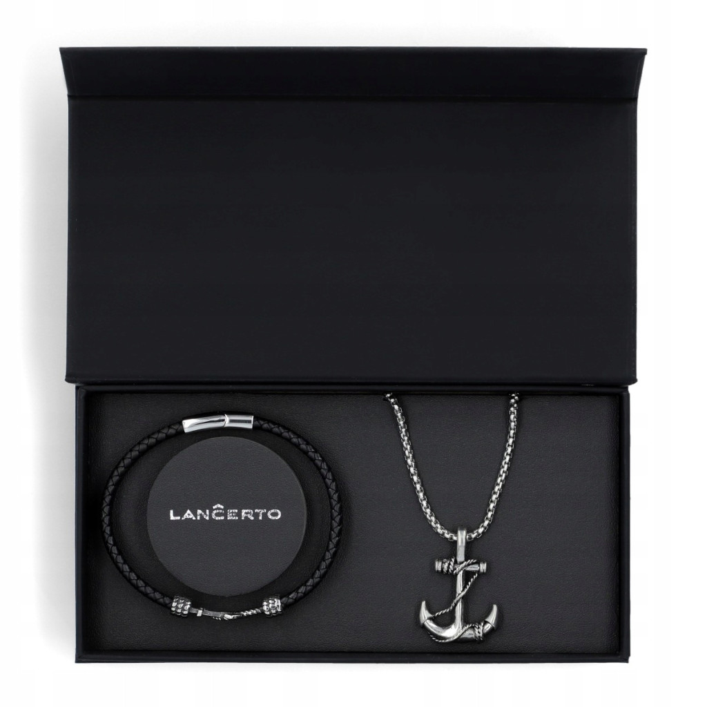 Idealny upominek dla mężczyzny, który kocha morze, sporty wodne albo po prostu lubi piękne rzeczy - zestaw prezentowy, który zawiera skórzaną, plecioną bransoletkę oraz naszyjnik ze stali szlachetnej ze stylizowaną kotwicą. Naszyjnik posiada dodatkową zawieszkę z monogramem C. Wszystkie elementy metalowe wykonaliśmy ze stali szlachetnej. Stal 316L nie uwalnia związków niklu przy kontakcie ze skórą, dlatego też mogą jej używać alergicy. Elementy dekoracyjne są trwałe, nieuczulające i posiadają właściwości antykorozyjne. Zaś wytrzymałe zapięcie magnetyczne sprawia, że bransoletkę łatwo się zakłada i zdejmuje. Długość bransoletki to 20 cm. Zestaw LANCERTO jest pakowany w gustowne pudełko z tłoczonym logo, co sprawia, że będzie idealnym prezentem dla eleganckiego mężczyzny.