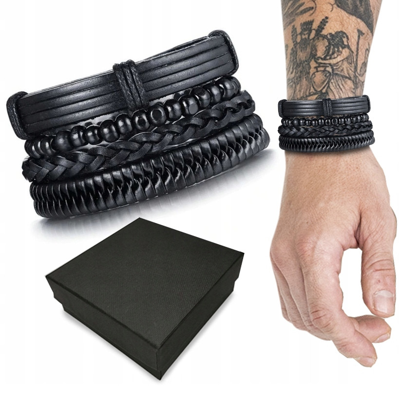Przedstawiamy Państwu zestaw regulowanych czterech stylowych bransoletek wykonanych z ekologicznie wytworzonej skóry PU + drewnianych koralików.
