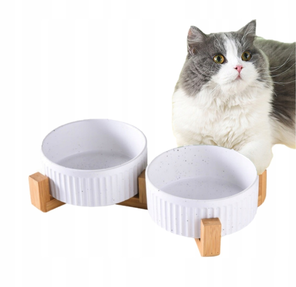 ★ 2 białe ceramiczne miski na stabilnej podstawie z naturalnego drewna bambusowego.