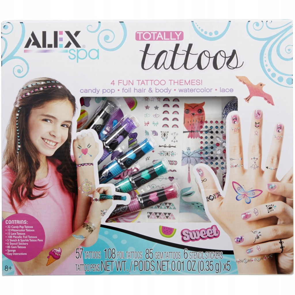ZESTAW ZAWIERA 57 tatuaży, 108 tatuaży foliowych, 85 tatuaży z klejnotami, 6 naklejek szablonowych, 5 pisaków do szkicowania i błyszczących tatuaży, gąbkę.