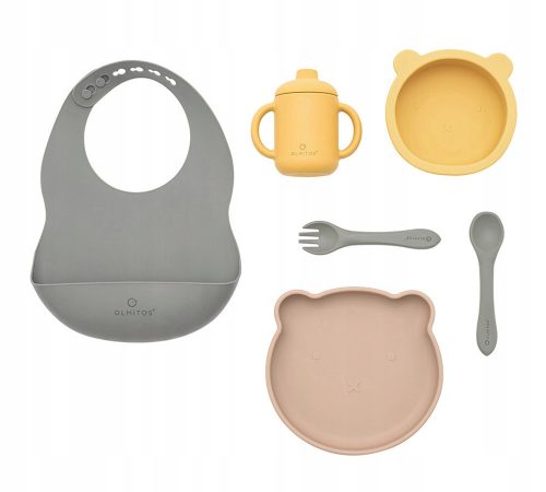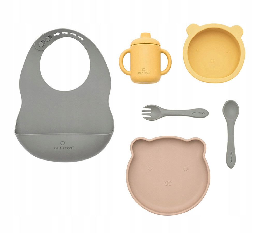 Zestaw obiadowy hiszpańskiej marki OLMITOS. Idealny do używania w okresie rozszerzania diety dziecka. Wykonany z najwyższej jakości 100% silikonu przeznaczonego do kontaktu z żywnością, spełniającego rygorystyczne niemieckie wymogi LFGB.