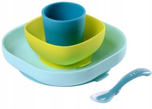 Silikonowa miseczka z przyssawką francuskiej marki BEABA posiada ergonomiczny, kwadratowy kształt z wysokimi, zaokrąglonymi po bokach brzegami, które ułatwiają dziecku samodzielne nabieranie posiłku na widelec lub łyżkę.