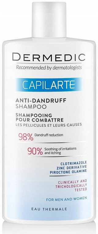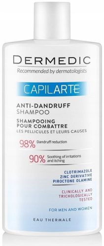 DERMEDIC Capilarte szampon zwalczający łupież i jego przyczyny. Rozwiązanie dla kobiet i mężczyzn zwalczające łupież i jego przyczyny. Jest produktem o działaniu przeciwłupieżowym i przeciwgrzybicznym. Łagodnie oczyszcza włosy i skorę głowy, jednocześnie łagodząc objawy łupieżu o rożnej etiologii, zarówno suchego, jak i tłustego. Zapobiega też nawrotom łupieżu. Szampon reguluje proces odnowy komórek skóry, co prowadzi do redukcji nadmiernego złuszczania naskórka. Normalizuje przy tym aktywność gruczołów łojowych i wykazuje działanie kojące - łagodzi podrażnienia i niweluje świąd. Nawilża i odżywia włosy. Gliceryna i panthenol nadają włosom połysk, przeciwdziałają rozdwajaniu końcówek i sprawiają, że włosy są gładkie i łatwo się rozczesują. Dermedic szampon dzięki swojemu składowi działa nawet po jego zmyciu i w przerwach między jego stosowaniem. Produkt hypoalergiczny z wodą termalną. Przebadany klinicznie i trychologicznie.
