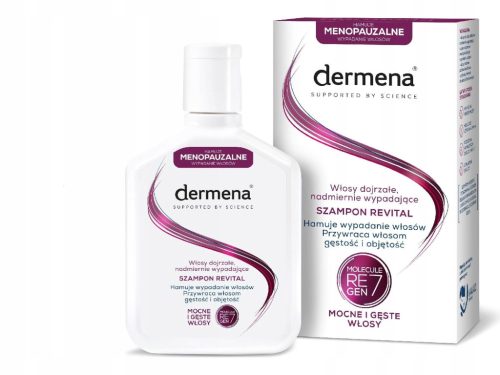 Szampon dermena® REVITAL został opracowany w odpowiedzi na potrzeby włosów dojrzałych, osłabionych, z objawami wypadania menopauzalnego. Jego formuła łączy działanie hamujące wypadanie włosów i stymulujące ich odrastanie z działaniem nawilżająco-regenerującym. Szampon przywraca włosom gęstość i objętość, sprawia, że włosy są bardziej odporne na działanie niekorzystnych czynników zewnętrznych. Wygładza włosy, wyraźnie nawilża i nadaje im blask i sprężystość. Pozostawia odczucie regeneracji i poprawy kondycji włosów. W efekcie włosy łatwo rozczesują się i układają, są miękkie i przyjemne w dotyku.