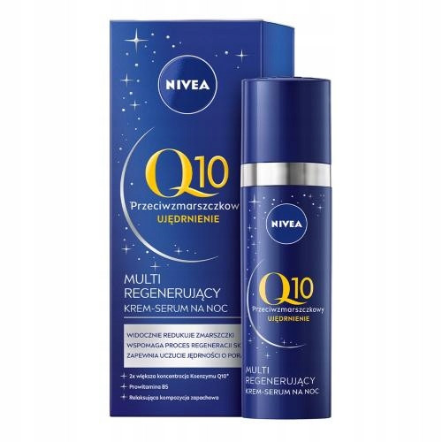 NIVEA Q10 Ujędrnienie Multi regenerujący krem na noc pomaga skórze jak najlepiej wykorzystać czas snu do intensywnej regeneracji. Krem do cery aktywnie zwalcza procesy starzenia się, widocznie nawilża i odmładza skórę.