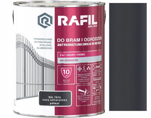 Antykorozyjna Emalia RAFIL DO BRAM I OGRODZEŃ przeznaczona jest do ochronno-dekoracyjnego malowania powierzchni metalowych: stalowych, ocynkowanych i aluminiowych eksploatowanych na zewnątrz pomieszczeń.