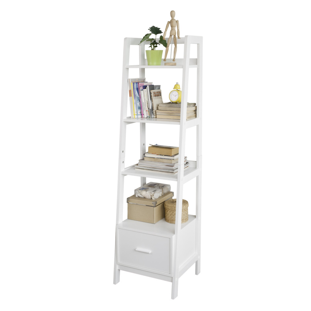 Nowoczesna półka drabinkowa z płyty MDF z trzema półkami i jedną szufladą.