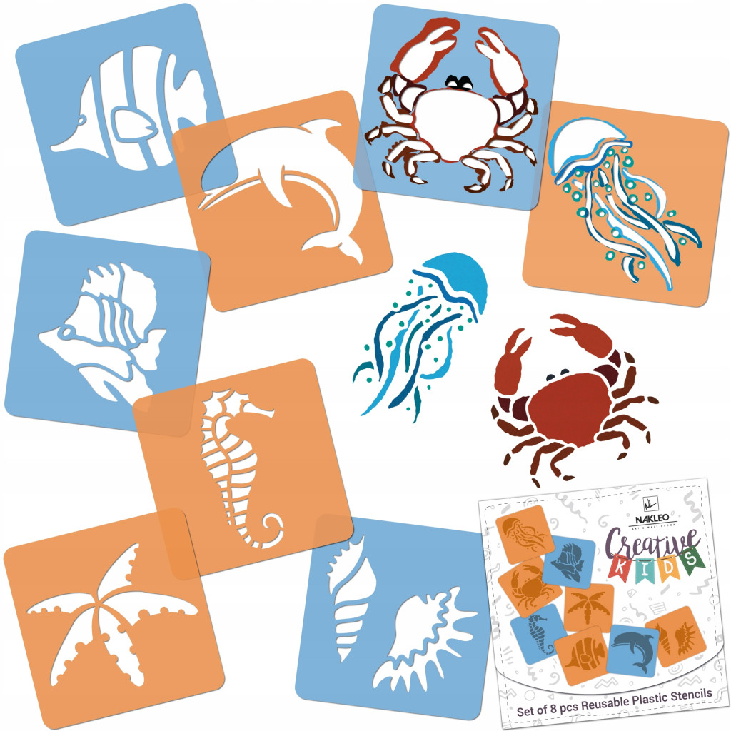 Nakleo Creative Kids to seria szablonów do rysowania stworzonych po to, aby pomóc dzieciom rozwijać talent malarski. Wytrzymałe, elastyczne i kolorowe, wykonane z bezpiecznego dla dzieci tworzywa sztucznego przetrwają wiele godzin dziecięcych zabaw. Każdy zestaw składa się z 8 arkuszy wielokrotnego użytku o wymiarach 15x15cm. Z pomocą naszych produktów Twoje dziecko rozwinie nie tylko swoją wyobraźnię, ale także zdolności manualne.
