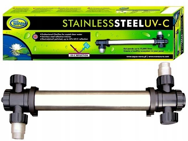 Sterylizator australijskiej firmy AQUA NOVA UV 75W posiada obudowę ze stali nierdzewnej, długa obudowa z refleksem zapewnia o 35% większą wydajność sterylizacji.