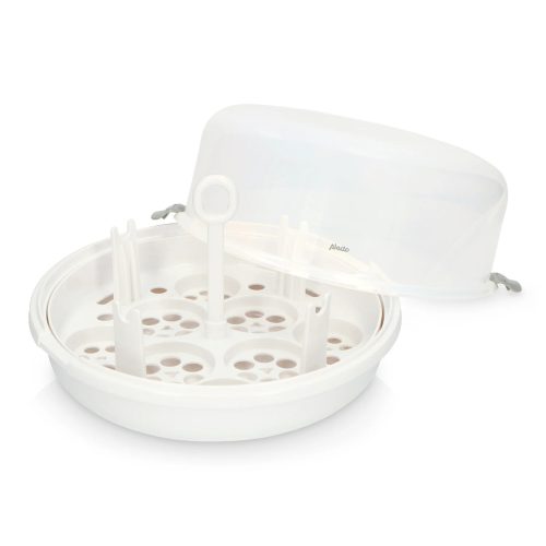 Butelka do sterylizacji to solidny, lekki pojemnik z pokrywką. Opłucz butelki i smoczki i włóż je do pojemnika do góry dnem. Na dno pojemnika wlej około 120 ml zwykłej wody z kranu. Zamknij pojemnik, umieszczając pokrywkę na górze i włóż go do kuchenki mikrofalowej. Włącz kuchenkę mikrofalową na najwyższe ustawienie na sześć minut i gotowe. Butelki są teraz nieskazitelnie czyste i można je przechowywać w sterylności aż do 24 godzin, pod warunkiem, że pokrywa pojemnika pozostaje zamknięta. Sterylizator do butelek pomieści jednocześnie cztery butelki o pojemności 250 ml i pasuje do każdej konwencjonalnej kuchenki mikrofalowej.