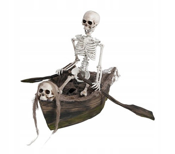 Dekoracja na Halloween do umieszczenia na podłodze lub stole z ogranicznikami. Łódź wykonana jest z pianki wystylizowanej na drewno. W łódce umieszczony jest szkielet, który trzyma wiosła. Na przodzie łajby znajduje się dekoracja z trupiej czaszki.