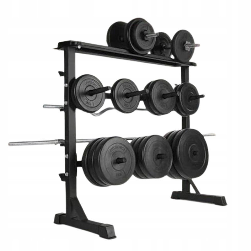 Stojak został zaprojektowany z myślą o maksymalnej funkcjonalności. Z miejscami na cztery gryfy oraz siedmioma uchwytami na talerze, masz wszystko, czego potrzebujesz, aby utrzymać porządek w swojej siłowni. Miejsca na gryfy są umieszczone na różnych wysokościach od podłoża (76,5 cm, 58,5 cm, 40,5 cm i 22,5 cm), co ułatwia dostęp do obciążenia. Każdy uchwyt ma długość 20,5 cm i średnicę 25-26 mm, co sprawia, że są one kompatybilne z większością standardowych talerzy.