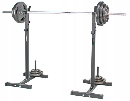 Uniwersalny trening w domowych warunkach - stojaki umożliwiają bezpieczny trening ze sztangą w przysiadzie oraz na ławeczce.