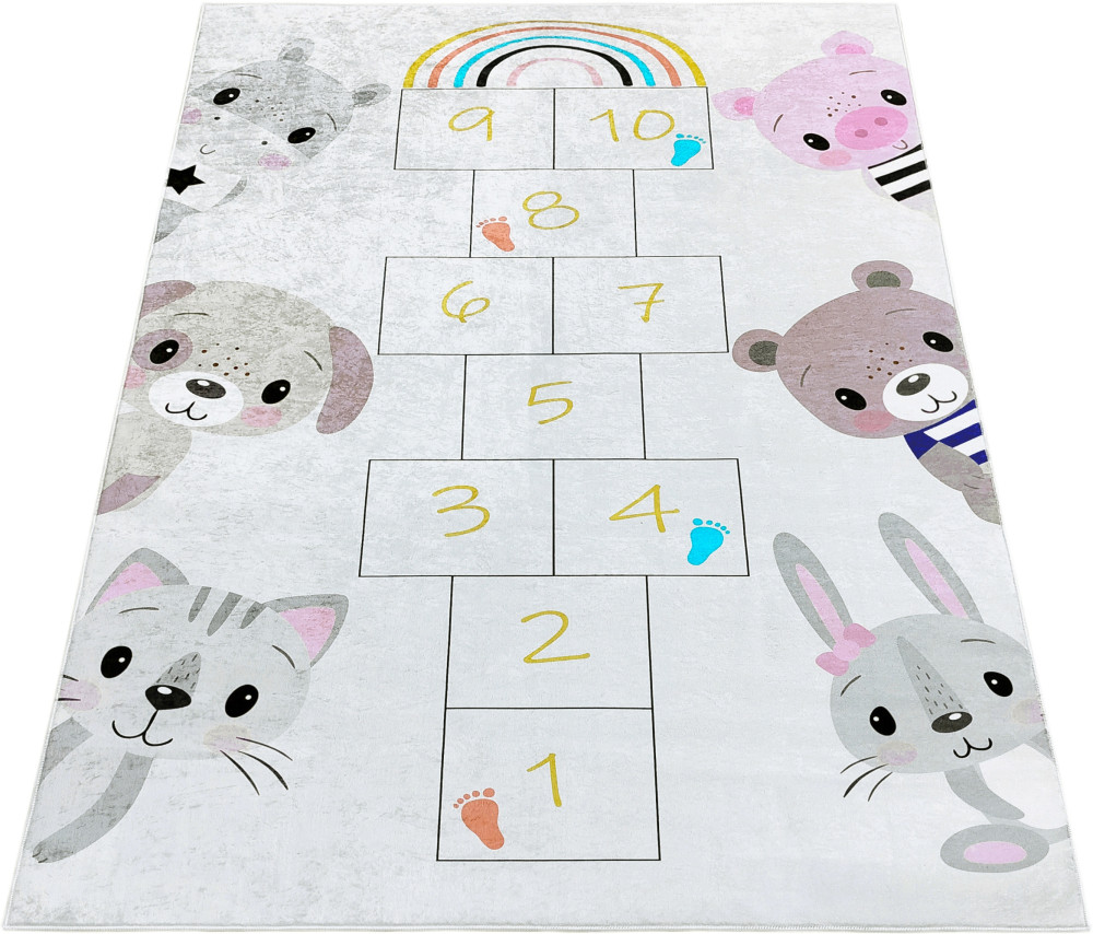 Dywan ma bardzo krótki włos i jest wykonany z wysokiej jakości materiałów, co zapewnia doskonałą przyczepność do podłogi. Jego jasne, biało srebrne tło jest ozdobione wzorem przedstawiającym klasy z różnymi kolorowymi postaciami, co czyni go atrakcyjnym elementem dekoracyjnym w dziecinnym wnętrzu.