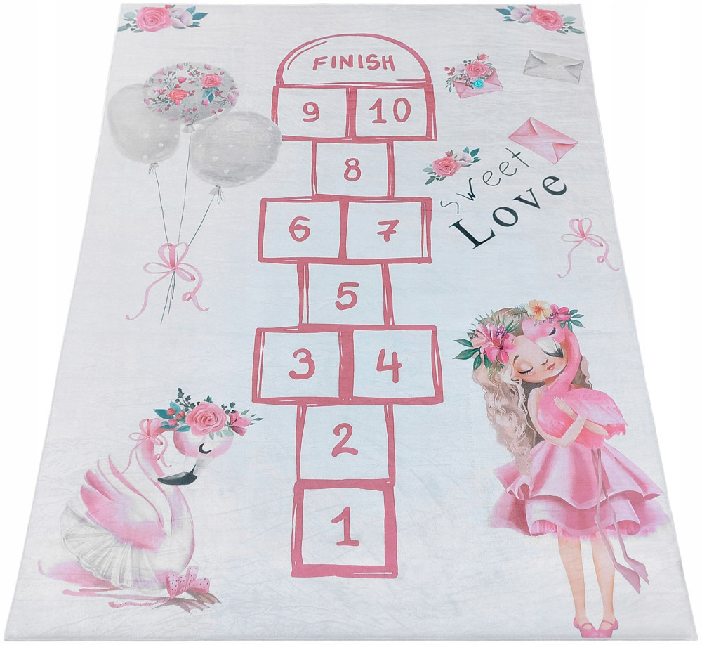 Dywan dla dzieci w formie gry w klasy, idealny do zabawy. Posiada jasne tło, które przechodzi płynnie w delikatny srebrny kolor. Jest wykonany z materiałów, które są bezpieczne dla dzieci i przyjazne dla skóry.