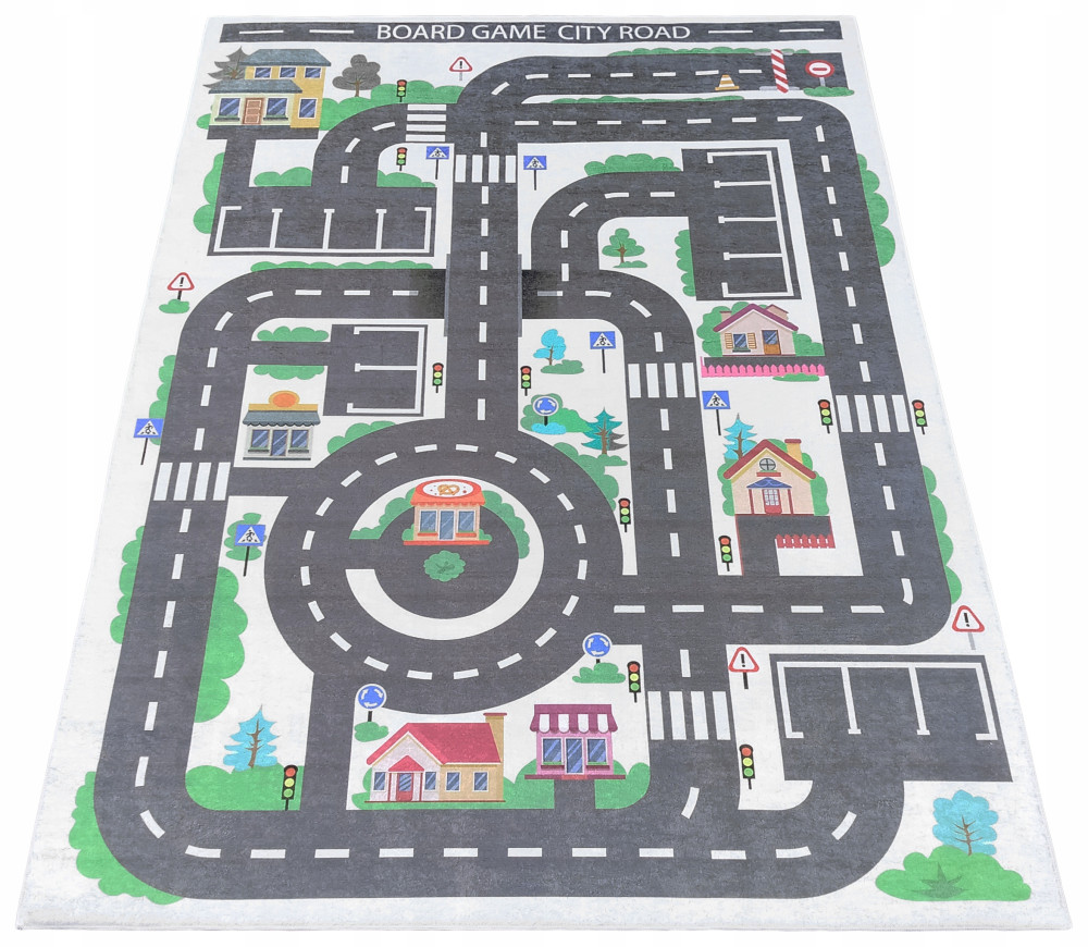 Dywan dla dzieci w formie ulicy, idealny do zabawy i tworzenia różnych scenariuszy. Posiada jasne tło, które przechodzi płynnie w delikatny srebrny kolor. Jest wykonany z materiałów, które są bezpieczne dla dzieci i przyjazne dla skóry.
