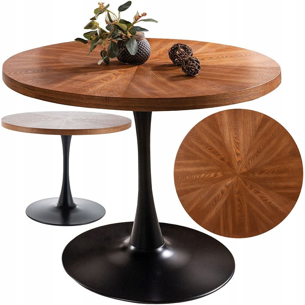 Orzechowy blat wsparty na nóżce z metalu, modny okrągły kształt, minimalistyczne wzornictwo inspirowane prostotą i oryginalna ciemna kolorystyka – to wszystko sprawia, że stół okrągły loftowy stanowi idealną propozycję wyposażenia małej kuchni lub jadalni. Taki model, ze względu na zastosowane rozwiązania konstrukcyjne, nie tylko nie przytłoczy wnętrza swoimi gabarytami, ale też pozwoli na dopasowanie odpowiedniej liczby krzeseł. Stół okrągły 100 cm na jednej nodze będzie świetnym wyborem zarówno dla pary, jak i dla 3-4 osobowej rodziny.