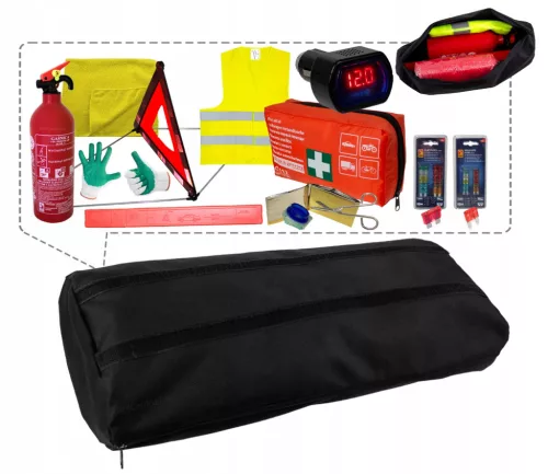 In accordance to the legal requirements, all medical devices included in the kit include the CE marking. The first-aid kit contains sterile and non-sterile medical devices. Medical devices are disposable. All products with a valid date should be checked regularly! Attention: Keep out of the reach of children. A properly completed first aid kit should be stored in a dry and shaded place as possible. Manufacturer: ZPH PK-MOT, Made in Poland, nr SRN: PL-PR-000027277