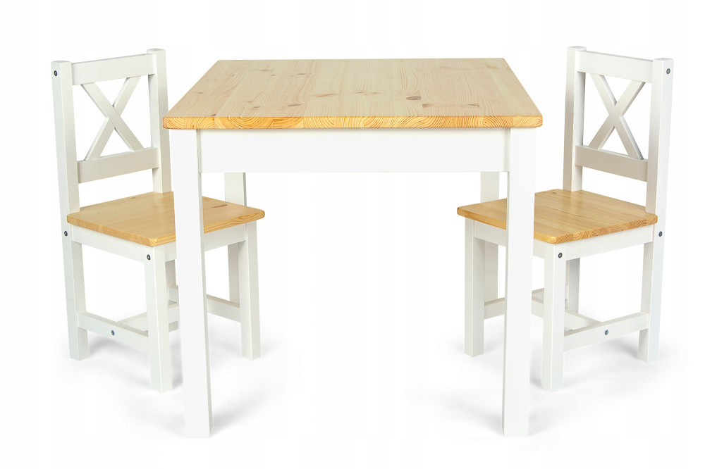 Blat i siedziska krzesełek w naturalnym kolorze drewna, nogi i oparcia lakierowane na biało. Zarówno stolik jak i siedziska krzesełek mają zaokrąglone rogi.