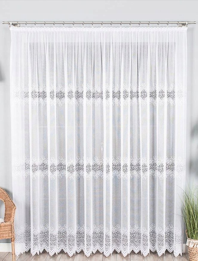 Firanka z ładnym wzorem , doskonale się układa i nie wymaga prasowania. Firanka od góry wykończona fabrycznie z taśmą marszczącą, boki obszyte. Będzie pasowała do każdego wnętrza.