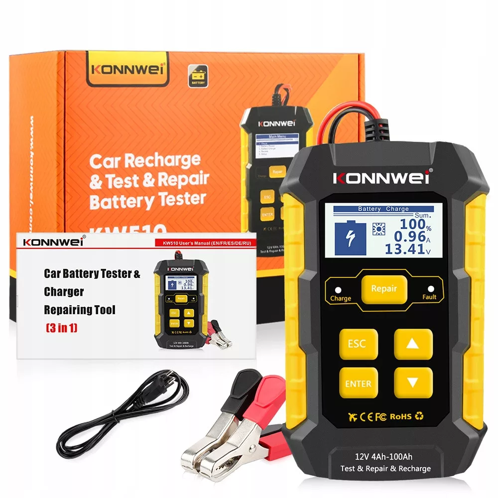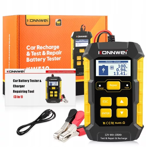Tester akumulatorów 12 V KW510 umożliwia ogólną analizę stanu akumulatora poprzez sprawdzenie jego napięcia i rezystancji wewnętrznej. Następnie informuje, czy akumulator wymaga naładowania.